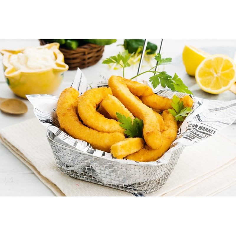 Corte especial de calamar en tiras que lo hace especialmente tierno al comerlo y con un rebozado muy crujiente.