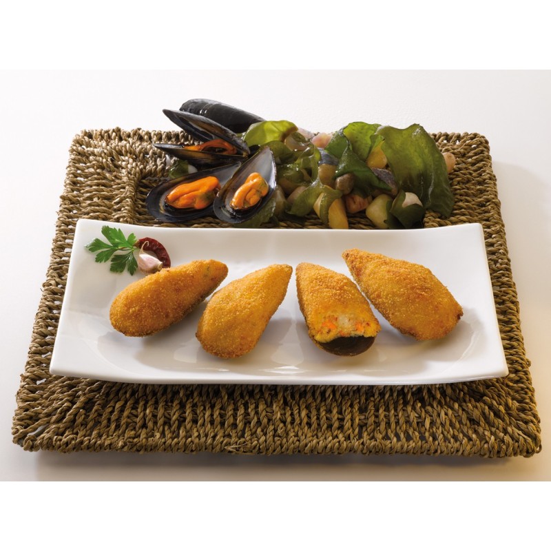 Ingredientes: Agua, MEJILLON 22% (MOLUSCO), pan rallado (harina de TRIGO, agua, sal, levadura, harina de TRIGO, tomate, cebolla, pimiento, calabacín, berenjena, azúcar, espesantes (E-1422, E-461 y E-410), aceite de girasol, sal, corrector de acidez (E-330 y E-331), suero LACTEO, aceite de oliva, almidón de maíz y perejil.INFORMACION PARA ALÉRGICOS: Puede contener trazas de CRUSTACEO, PESCADO, HUEVO, SOJA Y APIO.