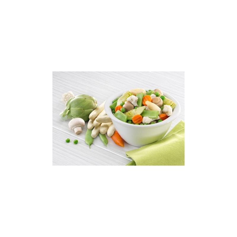 Ingredientes: Guisante, judía plana, zanahoria en rodajas, alcachofa en trozos y coliflor, coles de bruselas,borraja, tallos de espárragos.ALÉRGENOS:Puede contener trazas de apio, huevo y crustáceos.